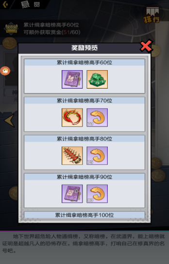 修真者达到筑基巅峰期即可解锁悬赏玩法,暗榜的风云人物,在江湖中传说四起,有十恶不赦的歹毒之辈,也有劫富济贫的道义人士,可以肯定的是,暗榜人物在修真界都是不可小视的存在,在悬赏玩法内各位修真者可大展身手,更有海量道具等你来拿,内丹、悟灵露、功法等等稀释珍宝,均可尽收麾下,只要累计缉拿暗榜高手对应的一个数量即可获得左上角宝箱内里的道具,在右上角的排行能还能看到其他修真者的一个信息情况哦~ 悬赏榜单在总排行榜(战力、境界、宗门、悬赏)占据一席,想在都市打响名号,就必须榜上有名,悬赏榜单虽准入门槛较低,但上限极高,各位修真者是不是都跃跃欲试了呢?