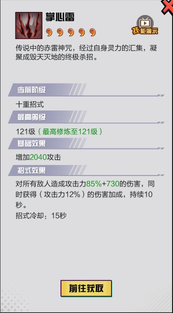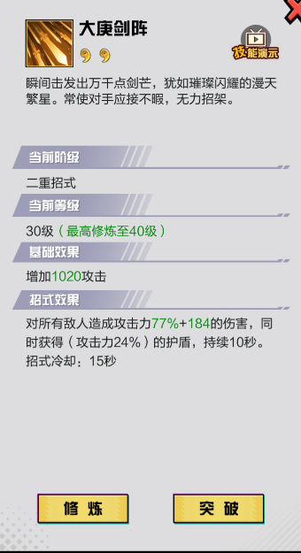 「招式」=个人技能,招式分为单体还有群伤,在金丹二阶时解锁下方全部招式栏,可最多上阵八个招式,(获得途径充值礼包/探宝/悬赏等)每个招式都携有不同技能,推荐以群伤招式为主,单体招式为辅,前期可先培养单体技能,后面等有群伤时候在主培养群伤技能