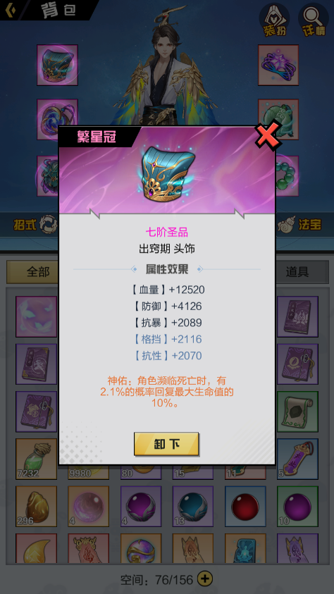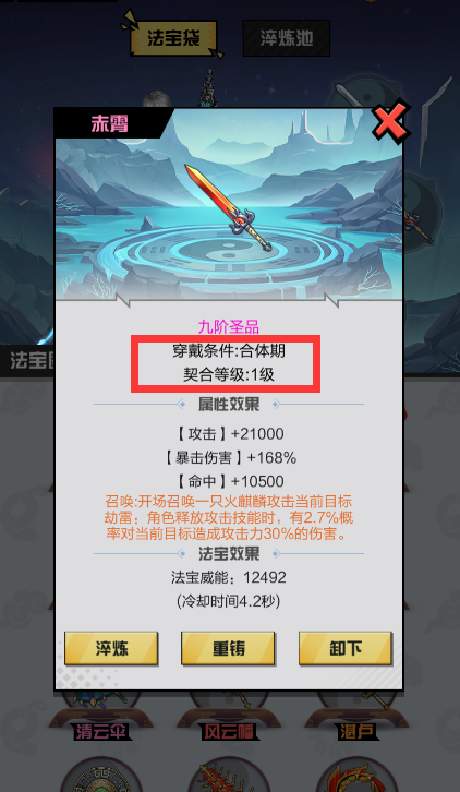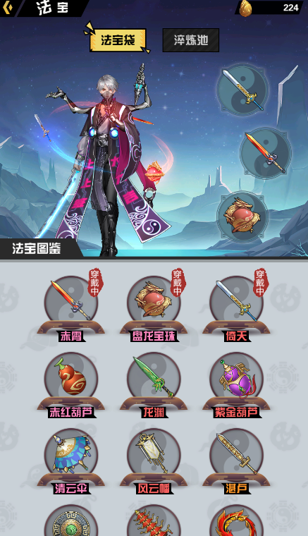 「法宝」=辅助道具,(可在悬赏界面通关解锁获得)在战斗时法宝作为辅助工具也是重要的一环,携带法宝也需要对应的条件点击相应的法宝查看即可,推荐优先级圣品>仙品>神品>绝品>上品,可法宝淬炼池里进行淬炼提升法宝,重铸(使用臻宝元精)也能提高法宝属性哦