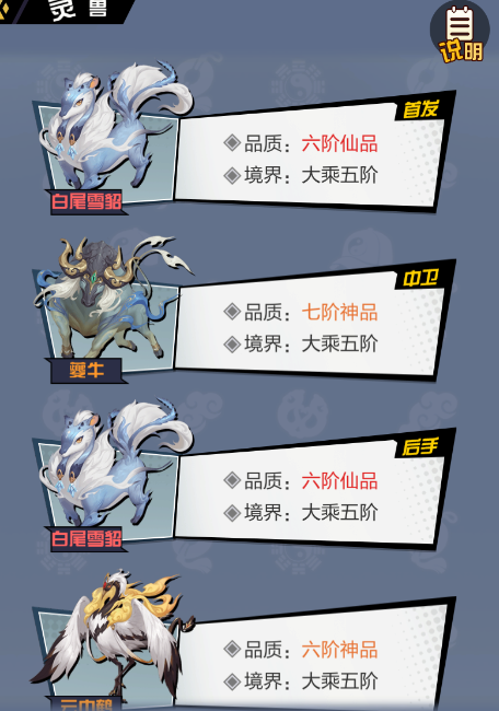 当开到心仪的灵兽时,就可以根据出战境界要求进行配队,灵兽有3个位置,分别为首发、中卫、后手,首发灵兽阵亡后中卫灵兽出战,以此类推,全部阵亡后不会再有灵兽出战,每只灵兽内的技能也是各不相同的哦~修真可通过点击灵兽内自行查看的哦~ps:灵兽栏可以通过使用灵玉进行解锁上限,最多12个!
